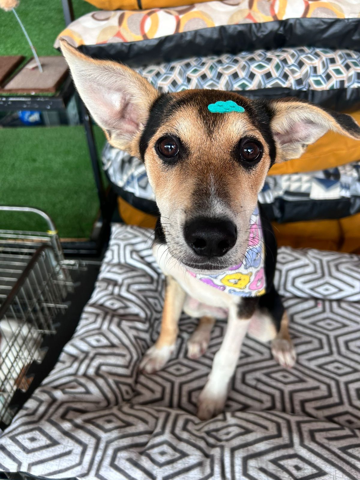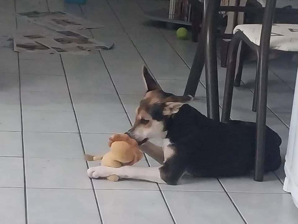 Espoleta foi regatada filhote, cresceu no abrigo. Foi adotada algumas vezes e devolvida, por conta das pessoas não entenderem na prática a adaptação de um filhote.